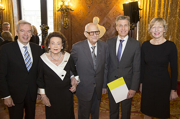 Preisverleihung: (v. l. n. r.): Akademiepräsident Prof. Dr.-Ing. habil. Prof. E.h. Edwin J. Kreuzer, Stifterehepaar Prof. Dr. h. c. Hannelore Greve und Prof. Dr. Dr. h. c. Helmut Greve, Preisträger Prof. Dr. Mathias Jucker, Zweite Bürgermeisterin der Freien und Hansestadt Hamburg und Senatorin für Wissenschaft und Forschung, Dr. Dorothee Stapelfeldt.
