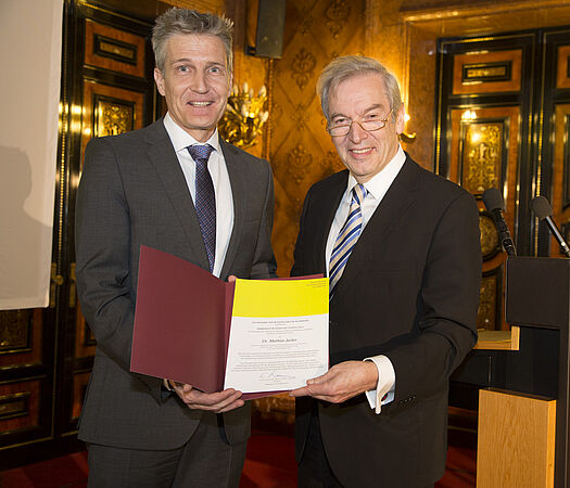 Urkundenübergabe: Preisträger Prof. Dr. Mathias Jucker (links), Akademiepräsident Prof. Dr.-Ing. habil. Prof. E.h. Edwin J. Kreuzer