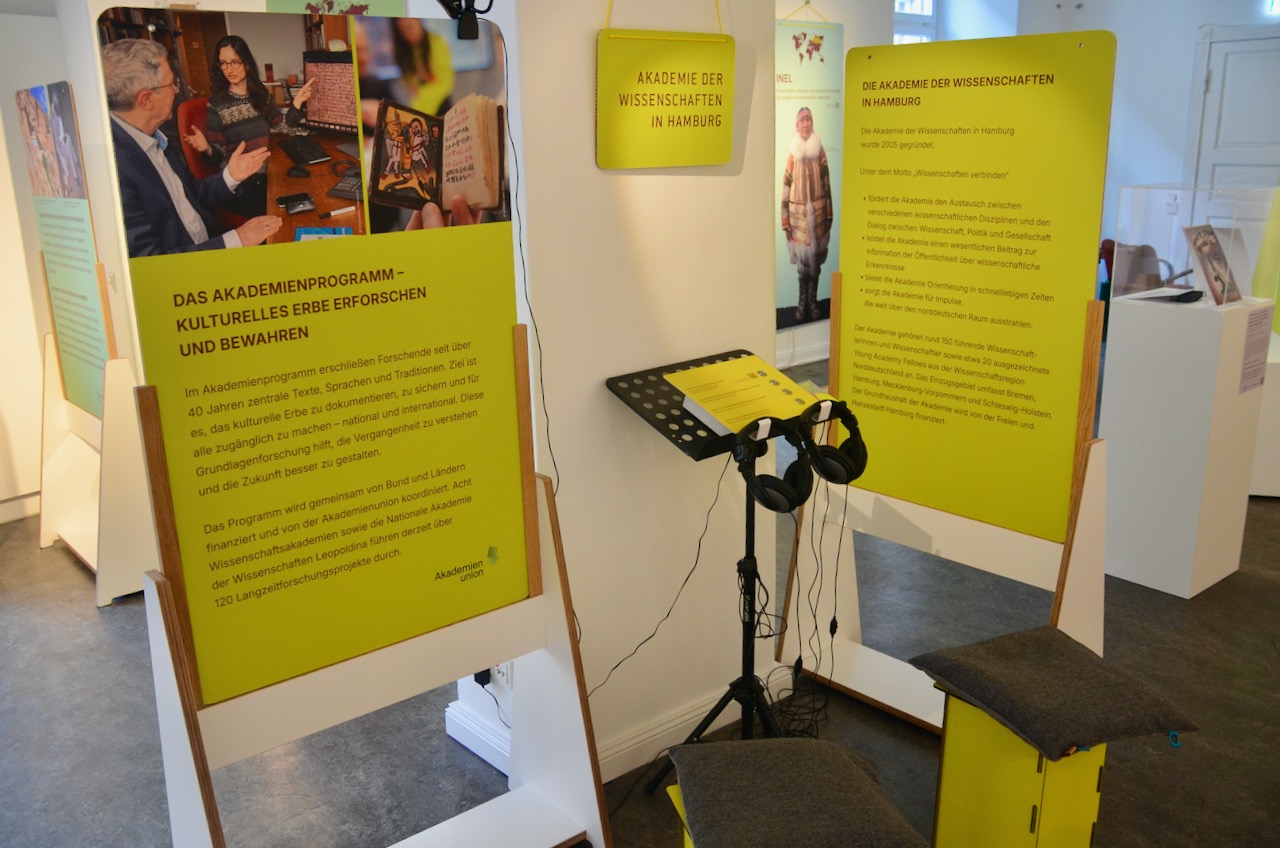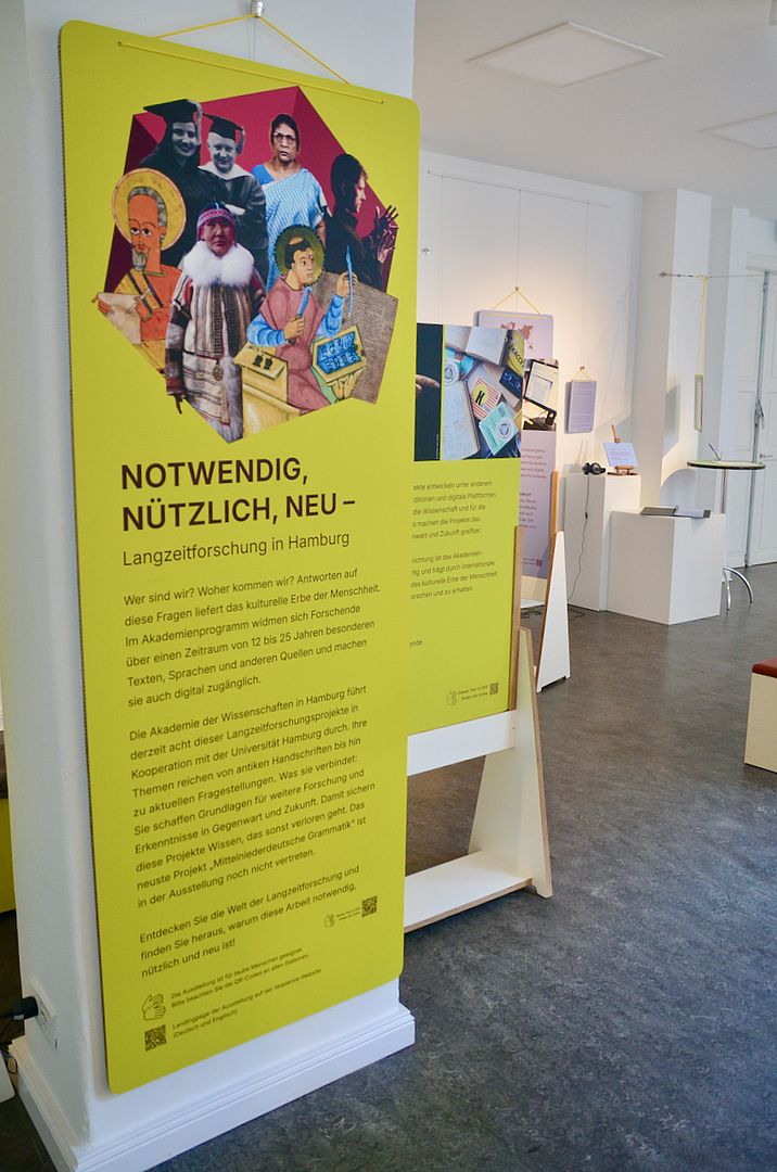 Die Akademie der Wissenschaften in Hamburg führt derzeit acht Langzeitforschungsprojekte in Kooperation mit der Universität Hamburg und der Hochschule für Musik und Theater München durch. Ihre Themen reichen von antiken Handschriften bis hin zu aktuellen Fragestellungen. Was sie verbindet: Sie schaffen Grundlagen für weitere geisteswissenschaftliche Forschungen national wie international und liefern Erkenntnisse für Gegenwart und Zukunft. Damit sichern diese Projekte Wissen, das sonst verloren ginge. Das neueste Projekt „Mittelniederdeutsche Grammatik“, gestartet im Januar 2026, ist in der Ausstellung noch nicht vertreten.