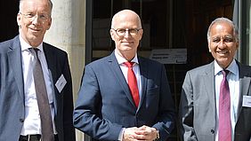 Bildunterschrift: Akademiepräsident Prof. Dr. Mojib Latif (rechts) begrüßte gemeinsam mit dem Sprecher der Arbeitsgruppe „Infektionsforschung und Gesellschaft“, Prof. Dr. Ansgar W. Lohse (links), Hamburgs Ersten Bürgermeister Dr. Peter Tschentscher zum Symposium.